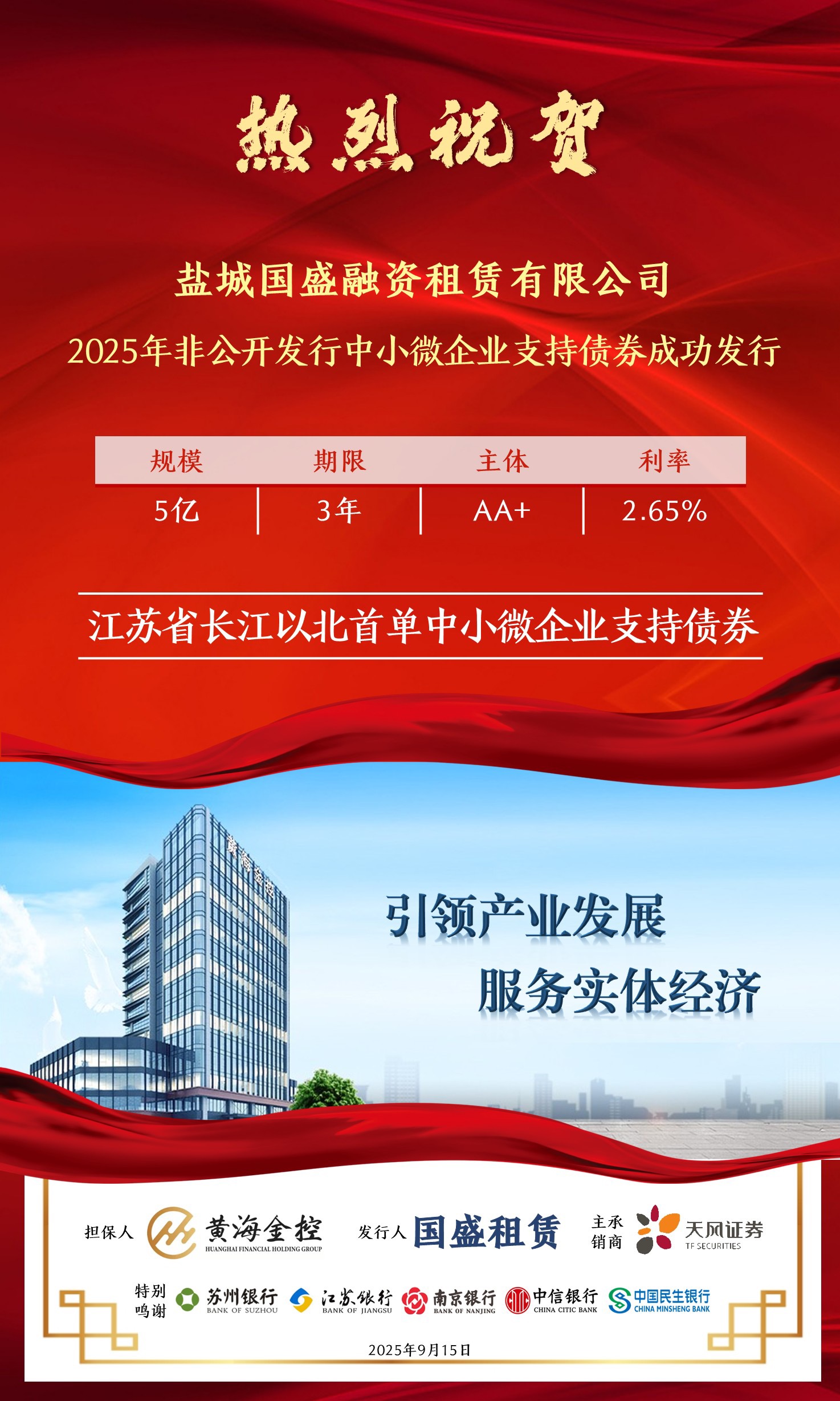 近日,盐城国盛融资租赁有限公司在上海证券交易所成功发行2025年面向专业投资者非公开发行中小微企业支持债券。本期债券由天风证券担任独家主承销商,发行规模5亿元,期限3年,票面利率2.65%。