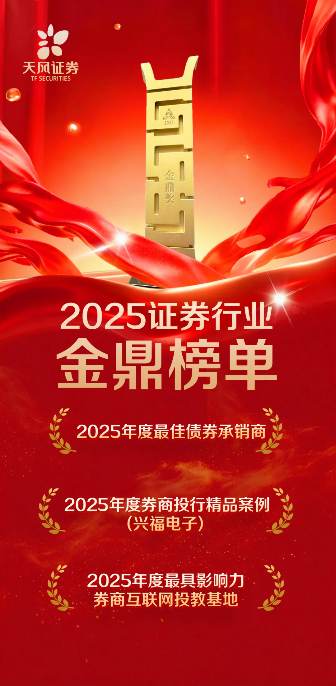 11月28日,由《每日经济新闻》主办的“2025资本市场高质量发展论坛”发布了“2025证券行业金鼎榜单”。天风证券一举获“年度最佳债券承销商”、“年度券商投行精品案例(兴福电子)”及“年度最具影响力券商互联网投教基地”等三项荣誉。