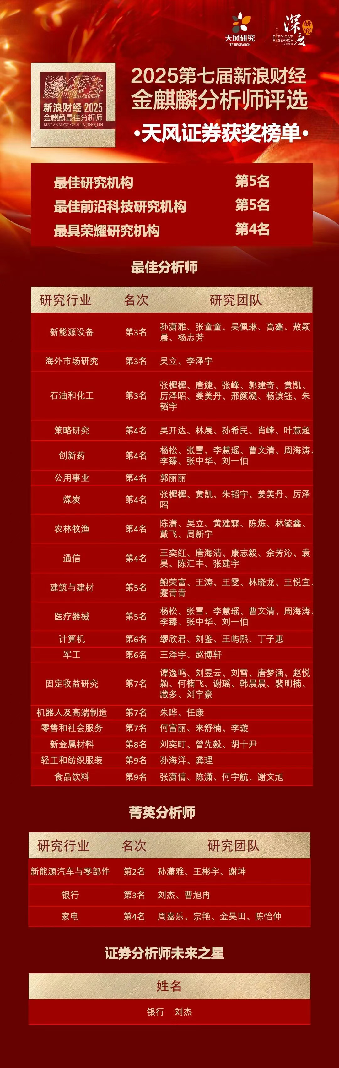 天风研究秉持“专业化、平台化、差异化、国际化”核心战略,锚定双重使命:既是集团协同发展的智慧中枢与价值放大器,亦是服务国家战略及区域经济的坚实智力支撑。第七届新浪财经金麒麟最佳分析师评选,在参选证券公司及买方投票机构数量上均创历史新高。天风证券再获殊荣,这既是对天风研究实力和行业影响力的权威认可,也体现了双重使命的践行成效。