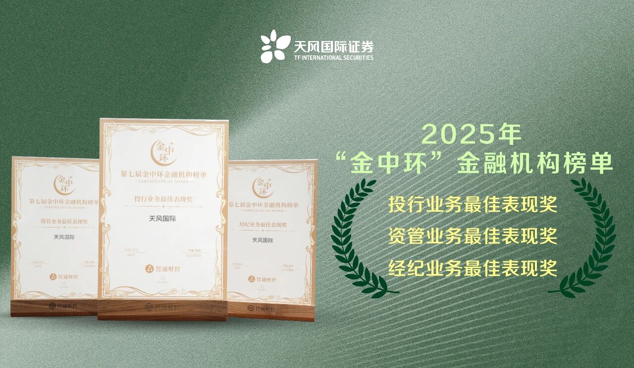 12月5日,由全球领先的港美股资讯平台智通财经、香港中资证券业协会主办的第七届“金中环论坛暨金融机构榜颁奖典礼”在香港中环圆满举行。活动中重磅揭晓了2025年“金中环”金融机构榜单,天风国际证券集团有限公司(以下简称“天风国际”)凭借在投行业务、资管业务及经纪业务等核心领域的卓越业绩,从众多参评机构中脱颖而出,一举斩获“投行业务最佳表现奖”“资管业务最佳表现奖”“经纪业务最佳表现奖”三大荣誉,充分彰显了业界对公司综合实力的高度肯定。
