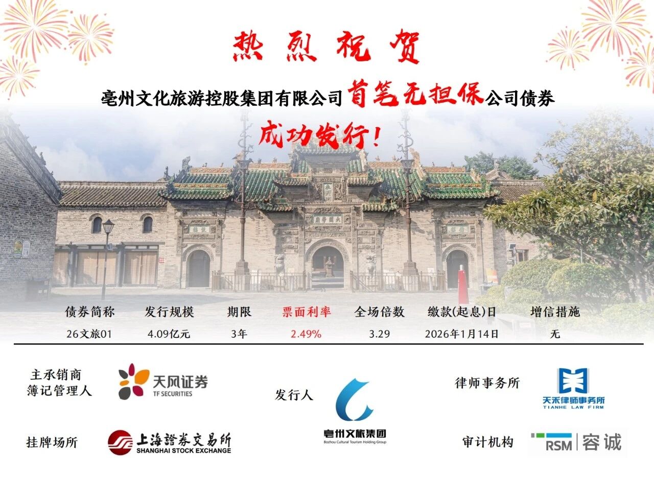1月12日,天风证券助力亳州文化旅游控股集团有限公司(以下简称:亳州文旅集团)在上海证券交易所成功簿记债券“26 文旅 01”,并于1月14日完成缴款起息。本期债券由亳州文旅集团面向专业投资者非公开发行,发行规模4.09亿元,期限3 年,票面利率2.49%。