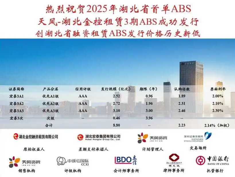 ◆ 天风-湖北金控租赁3期专项计划,成为全省2025年首单证券化产品,且创下省内融资租赁行业 ABS 发行价格新低;