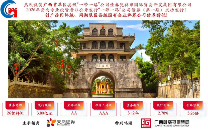 3月30日,由天风证券担任独家主承销商及簿记管理人的凭祥市国际贸易开发集团有限公司(以下简称凭祥国贸)2026年面向专业投资者非公开发行“一带一路”公司债券(第一期)(“26凭祥01”)在上海证券交易所成功发行。