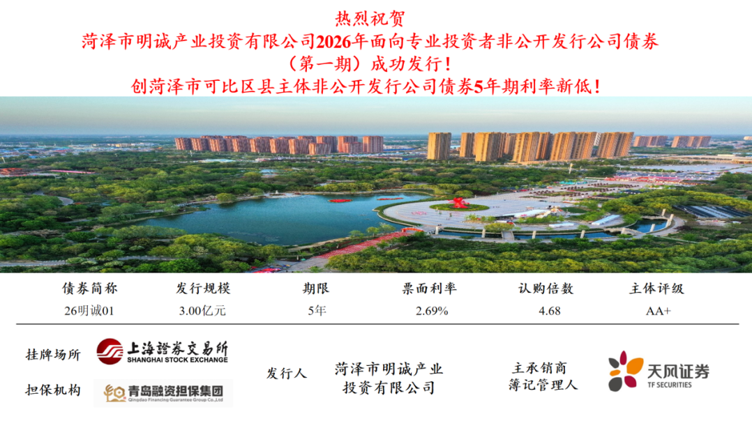 近日,由天风证券担任独家主承销商及簿记管理人的菏泽市明诚产业投资有限公司(以下简称菏泽明诚)2026年面向专业投资者非公开发行公司债券(第一期)(“26明诚01”)在上海证券交易所成功发行。本期债券发行规模为3.0亿元,债券期限为5年期,主体评级为AA+,发行利率2.69%,全场倍数达到4.68倍。