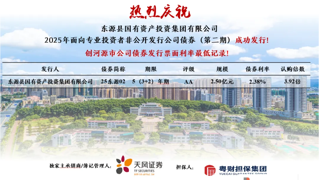 2.38%!天风证券独家主承销“25东源02”私募公司债,创河源市公司债券发行利率最低记录